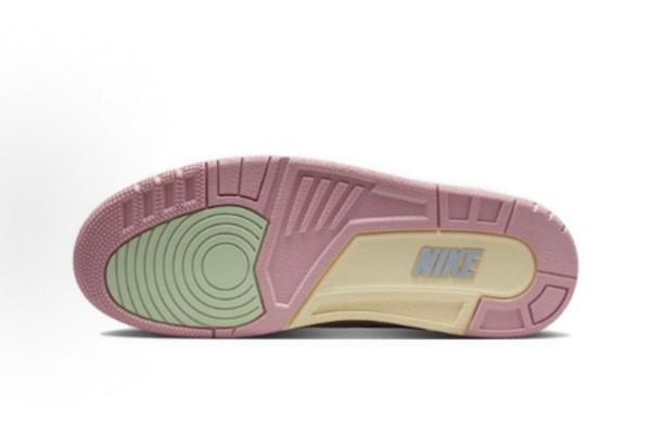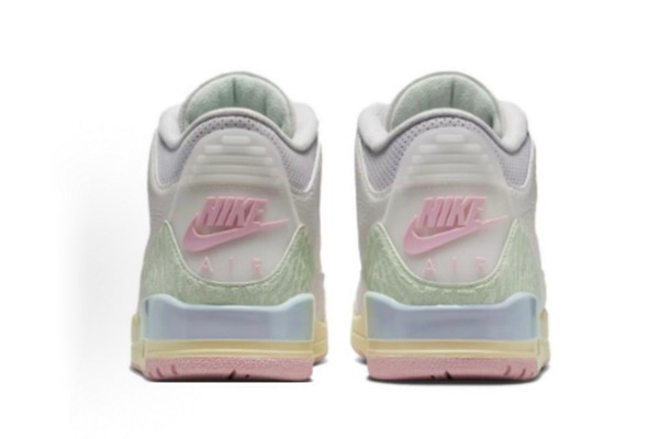 The main body of the shoe is made of delicate and soft beige lychee patterned leather, with a warm and luxurious texture that perfectly continues the iconic retro silhouette of the Air Jordan 3. The shoe is breathable and perforated with a classic burst pattern structure. The classic burst pattern on the side of the shoe is presented in low saturation mint green, with a delicate retro texture that outlines layers in the pure white shoe body; The edge of the toe and outsole is infused with soft mist cherry blossom powder edging, balancing the cool and warm low saturation tones, shedding the strong contrasting colors and showcasing a gentle and relaxed spring atmosphere.