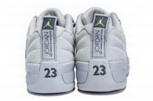 The Air Jordan 12 Low "Georgetown" is equipped with a full wolf gray suede upper and basketball-style leather texture veneer, with navy blue tongue logo and details. The whole shoe with rock gray as the main color, heel and insole LOGO with lemon yellow embellishment.