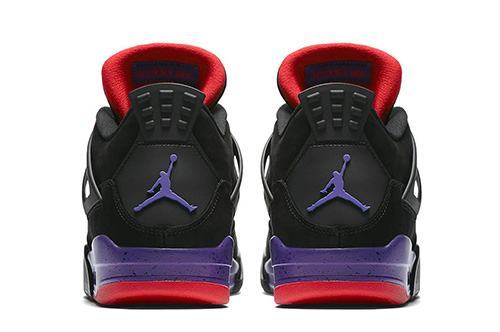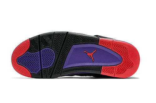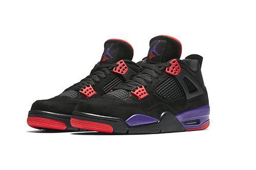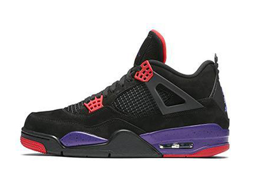 Air Jordan 4 NRG The “Raptors” upper is made of black textured suede. The laces and outer soles are decorated in red and the midsole is purple with a black splash effect. The overall style is similar to that of the Air Jordan 7 Raptor, which is rich in color but unobtrusive, creating a low-key vintage look.