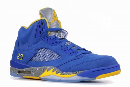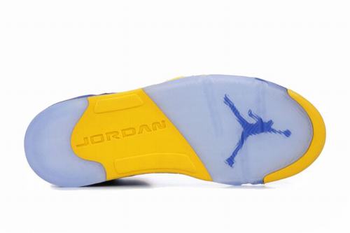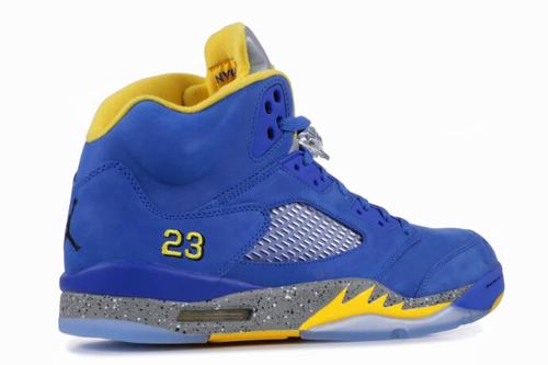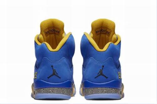 This update, called the Air Jordan 5 JSP, uses Laney's Varsity Royal and Varsity Maize colors, and contrasts the former as the main design with the original design. The details adorned the Jumpman logo on the tongue, and the spotted gray midsole was also up-and-coming.
