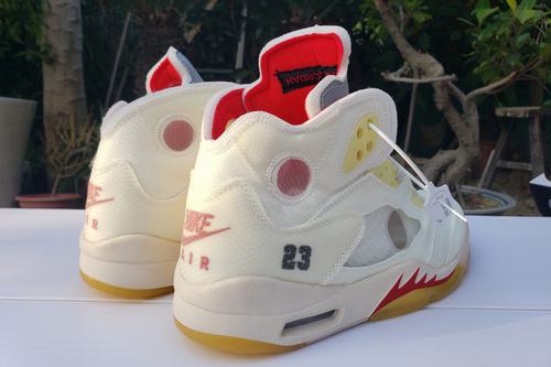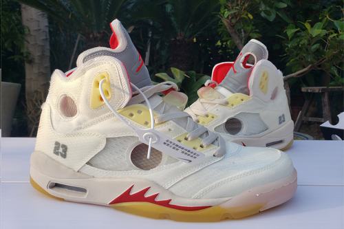 The air jordan 5 x O-W "cream" shoe still follows the old style in design. The cicada wing shell with oxidation effect makes the overall shape unique, with red details embellishment, giving people the sense of "fire red".