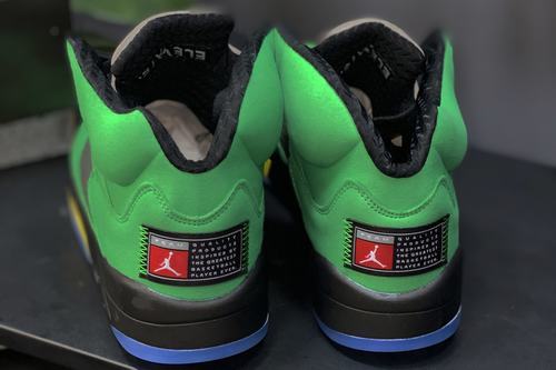 Air Jordan 5 SE Oregon Ducks green shoe body with black midsole, embellished with golden flame pattern, 3M reflective shoe tongue with capital O letter, cheap jordans heel is a cartoon image of Oregon duck, insoles are covered Duck feather pattern.