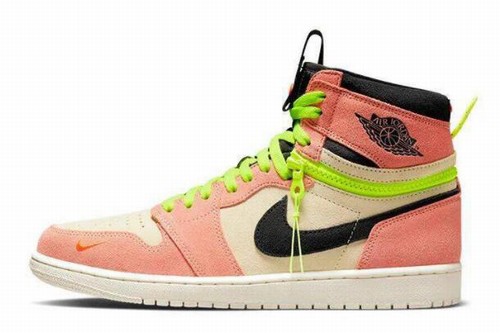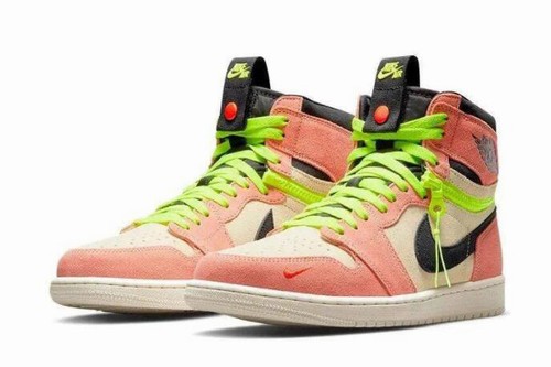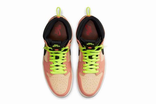 Air Jordan 1 is based on the general outline of the classic "black toe". Most of the shoes are made of Pink Volt with black toe, Swoosh, etc. The middle soles echo the black outsole, while the biggest change comes from the heel. The upper area and the heel are decorated with contrasting fluorescent green and Pink respectively, which make the classic low-key black toes look new.