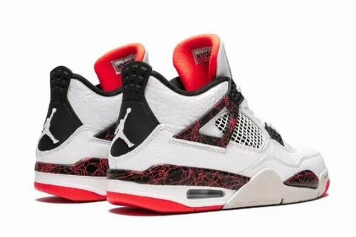 This pair of Air Jordan 4 Retro upper adopts white and black orange leather structure, and common mesh inserts are used in the quarter panel and upper. The molded perforations are finished with cement, which complements the polyurethane midsole. Visible Air in the heel provides cushioning and gives way to the rubber outsole to provide traction.