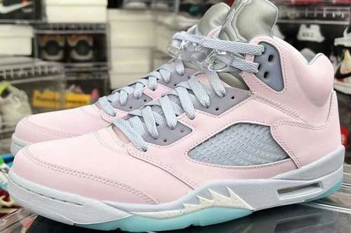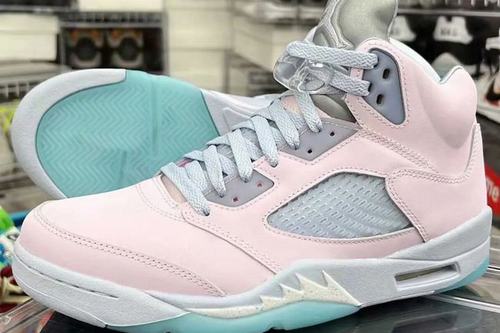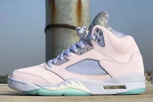 The Air Jordan 5 Easter features a Regal Pink, Ghost and Copa color scheme with a Regal Pink base paired with a silver tongue, muted blue contrast accents and spotted shark tooth overlays. A luminous translucent outsole with special packaging completes the design.