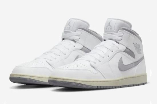 Air Jordan 1 Mid Vintage Grey features a white leather base with a Grey Swoosh, shoe collar, Wings logo, tongue branding and lining.