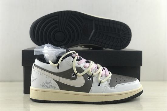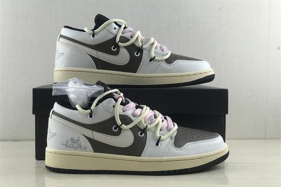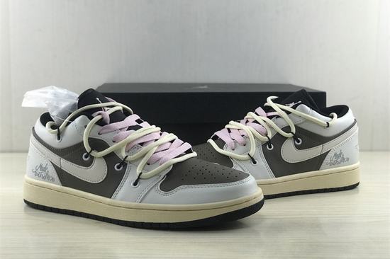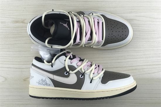 The upper of the Air Jordan 1 Low Mi Ka Joint is mainly made of Mocha brown top leather, and the frame of the shoe is covered with white leather. The low-key and steady body enriches the whole shoe's hierarchy. Brown design is used for tongue, lace and collar, pink lace lining and deconstruction strap.