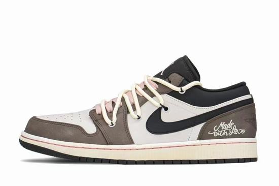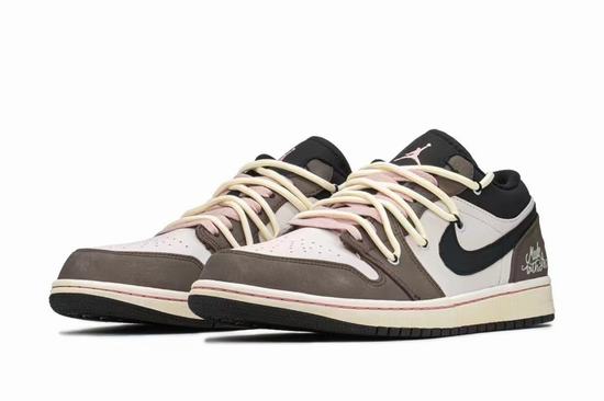 The Air Jordan 1 Low Mocha Brown is an innovative shoe that looks great. The Air Jordan 1 Low features a popular silhouette, timeless details, and strategic colors. Built in Air cushioning Natural leather and synthetic upper with Wings logo on the heel Foam midsole Rubber traction.  The upper of the Air Jordan 1 Low  Mocha Brown Valentine's Day is mainly made of beige top leather, and the frame of the cheap jordans is covered with mocha brown suede. The low-key and steady body enriches the layers of the whole pair of shoes. The tongue, laces and collar are designed in black, and the pink laces are lined with deconstructed straps.