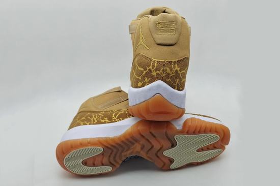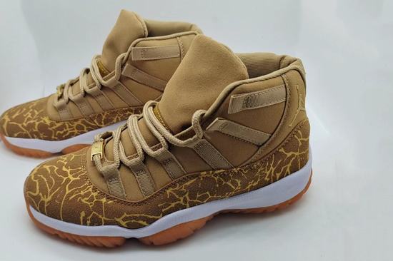 The Air Jordan 11 Golden Silkl Wheat shoe is made of suede, showing a completely different texture from the traditional 11th generation. The metallic textured wheat suede that replaces the original patent leather is more eye-catching. With the Jumpman Logo in rose gold tone and the raw rubber outsole, it is really suitable for autumn and winter.