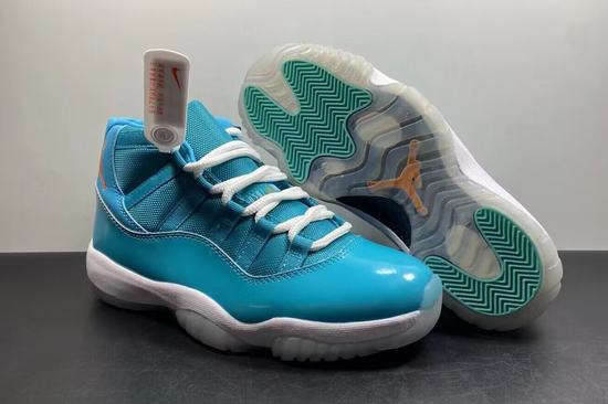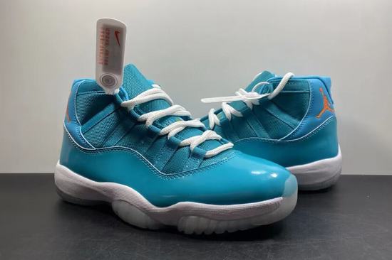 The Air Jordan 11 Miami Dolphins sample uses materials such as fabric, patent leather and leather, continuing the use of materials in the previous Air Jordan 11. The overall color scheme is mainly lake green, which is also the cheap jordan 11 retro main color scheme of the NFL Miami Dolphins jersey, and it also means the color scheme of the South Coast. The Jumpman Logo embroidery on the outside of the heel is decorated with orange, which is closer to the color of the Dolphins jersey. The outsole is made of transparent crystal material, supplemented by orange Jumpman Logo and lake green rubber decoration on the front and rear palms. Through the crystal bottom, you can see that the carbon plate of the Air Jordan 11 is really large, extending from the metatarsal area to the shoe.