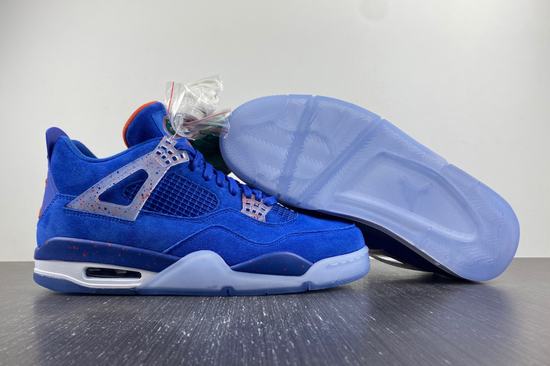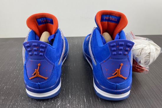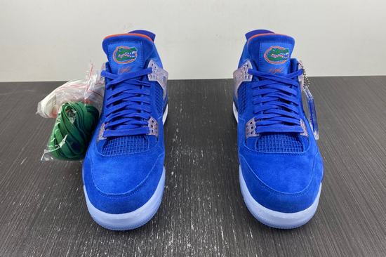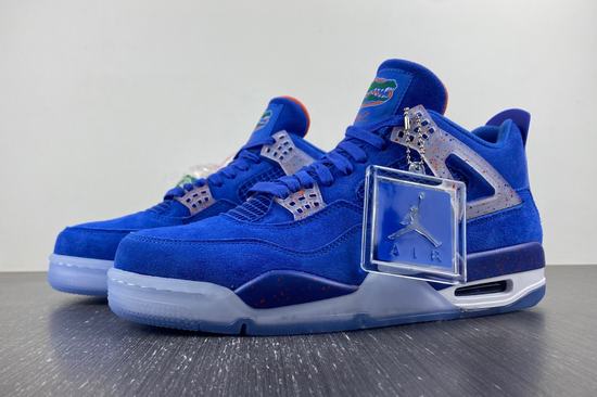 The Air Jordan 4 PE (Player Edition) shoe body is mainly blue, the representative color of the University of Florida, and the suede shoe body is full of texture. The lace buckle and the midsole show a color splash effect, with cheap jordans a translucent crystal outsole, the crocodile pattern on the tongue shows the identity of the shoe, and the overall tone is quite eye-catching. The Jumpman logo on the insole and heel is also reflected in the contrasting orange. The tongue is adorned with the green Super Gators logo. The body of the shoe is decorated with gorgeous and noble royal blue suede, and the tongue is supplemented by a warm urban color outline, which has a sense of Knicks color matching. The Jumpman Logo on the tongue is replaced by the Florida Gators team logo, which is very recognizable.