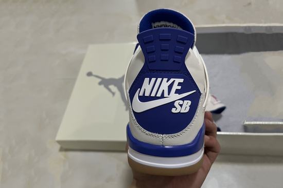 SB x Air Jordan 4 Sapphire follows the classic outline of Air Jordan 4, the shoe body is mainly white, the details are decorated with sapphire, the toe part is covered with gray suede, the sole part is with retro feeling of beef tendon, successfully creating a fresh atmosphere. Inject the theme color 'Sapphire' on the back of the tongue, Flight, LACES, mid-sole area, heel, and pull ring. For other details, note the classic red Jumpman Logo, grey suede overlay and raw rubber outsole. Of course, the biggest highlight is the SB Logo on the heel and the special shoe box created for both sides, which is very memorable.