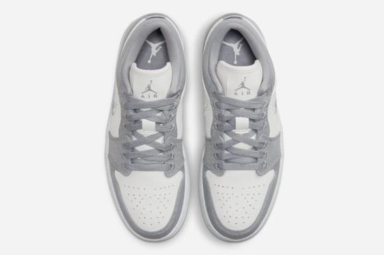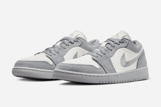 The Air Jordan 1 Low SE Light Steel Gray upper is made of canvas and leather, and the texture is comparable to the Union x Air Jordan 1 KO Low. The embroidered Swoosh on the side of the shoe is divided into upper and lower layers by stitching, which is quite similar to the design of Stüssy x Air Force 1. The midsole and outsole are designed in the same color for a more unified visual effect.