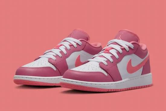 The Air Jordan 1 Low Desert Berry is a girly colorway, coordinating a tried-and-true two-tone upper, the latter's "Desert Berry" hue wrapping smooth leather overlays stitched into a simplified "Chalk White" base layer superior. Paired with a bright contrast of wing badges on the laces, midsole and heel counter, bright "coral" accents along the midfoot Swooshes combine with the Jumpman badge on the tongue, tread and insole for a selective but effective loud silhouette. The Air Jordan 1 Low Desert Berry features standout colorways and textures, reimagining the classic AJ1 sneaker for a fresh yet familiar look. High-quality materials and trims bring a new twist to classic favorites. Girls who like pink must not miss this pair of shoes, and the AJ1 low top is also a shoe type suitable for summer.