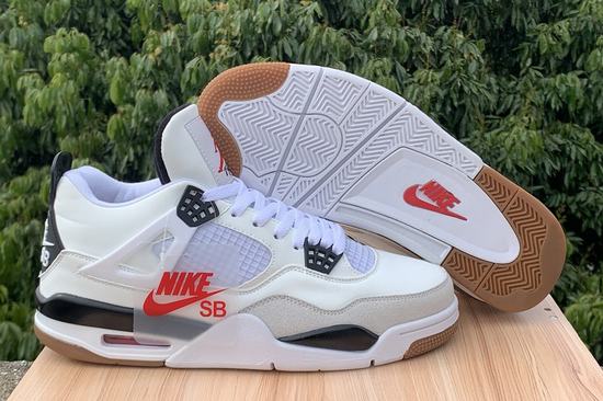 In addition, the SB x Air Jordan 4 classic Jumpman Logo, gray suede overlay and rubber outsole. The SB x Air Jordan 4 shoes are made of milky white leather fabric for the upper, and the toe edge is made of gray to make the overall shoe more three-dimensional. Creamy white midsole finished off with matching outsole. The SB Logo is printed on the heel of the shoe, and finally with the front and rear raw rubber outsole, highlighting the functionality as a skateboard joint shoes.