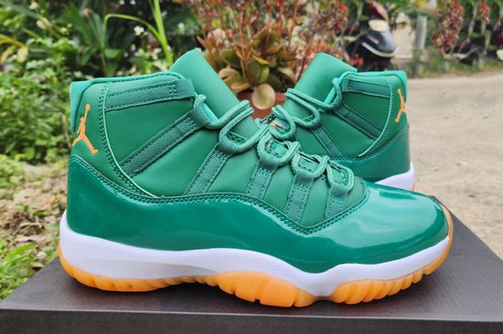 The overall color scheme of this Air Jordan 11 is mainly Lake Green, which is also the main color scheme for NFL's Miami Dolphins jersey, and also has a South Coast color scheme. The Jumpman logo embroidery on the outside of the heel is accented in orange, closer to the Dolphins' jersey color.