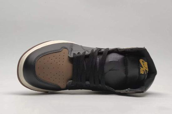 Air Jordan 1 High OG Palomino High Top Shoe DZ5485-020. The entire shoe design is composed of dark brown suede paired with black leather, with a color scheme and material overlap that is the same as the original color schemes such as "Bred" and "Shadow" in the past. The overall color scheme is like a color change version that is prohibited from wearing black and red. The original red frame has been changed to mocha suede material, reminiscent of the Travis Scott x Air Jordan 1. Wearing shoes is indicated by the letters in the accompanying picture. The color scheme is identical to the classic 'shadow'. The only thing that stands in stark contrast to the black brown combination on the upper is the Air detail on the tongue weaving label.
