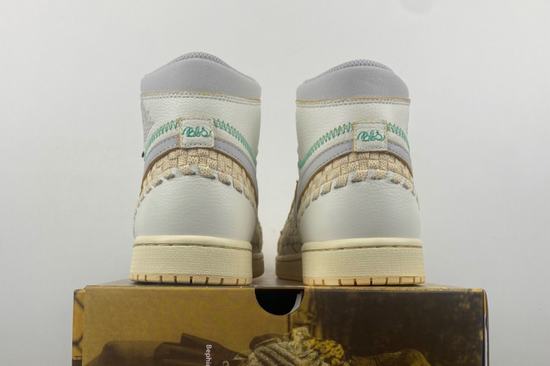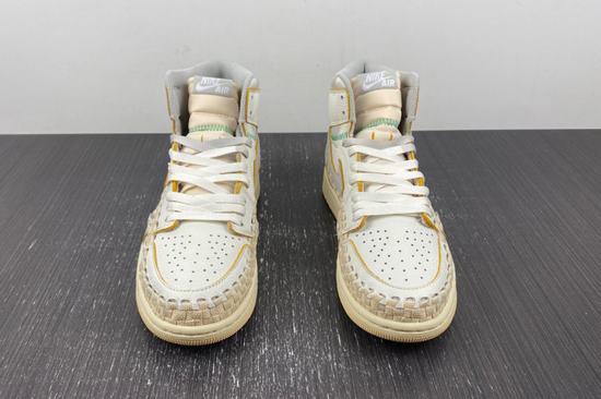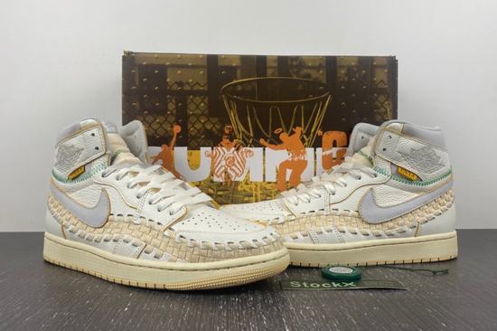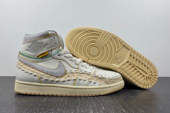 The design inspiration for the Union x Air Jordan 1 High OG Woven is evident, taking inspiration from the classic Air Footscape Woven, which blends the silhouette of the Air Jordan 1 with woven details, extending from the toe to the heel and surrounding the entire shoe. Other details include a yellowed leather cut, stitching at the collar, a large Air Jordan wing logo, and a UN/LA small label below, all of which are the same as the 2018 version, which was first co branded by both parties, At the same time, there is also the word BBS on the heel, highlighting the identity of the three parties! The Union x Air Jordan 1 High OG Woven features a predominantly beige tone, paired with gray and beige, exuding a vintage vintage look. The yellow coating is retained on the edge of the leather cut of the shoe, making the shoe more layered. Unlike previous designs, this time a classic woven element has been added to the shoe, connecting the upper through woven elements. The combination of leather and woven materials perfectly interprets the consistent deconstruction style, becoming the biggest highlight of this shoe. The iconic UN/LA label on the upper and the car line perfectly highlight the identity of the shoe. The entire pair of shoes features a white color with a vintage effect, paired with delicate lychee grain leather material that wraps around the body, showcasing the OG style and texture exclusive to the Air Jordan 1. The biggest highlight of this collaboration is the woven line design on the side, inspired by the classic Air Footscape Woven shoe, which greatly enhances the eye-catching properties of the shoe. In terms of other details, both the "UN/LA" label on the upper and the stitching design have been preserved, presenting joint details consistent with the previous Union. Finally, the joint identity of Union LA is reflected through details such as the weaving mark on the side and the obvious stitching on the shoe collar.