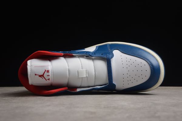 The shoe color scheme consists of white, dark blue, and red. The shoe upper is made of full leather, equipped with a mesh tongue and village. Two tone rubber sole with perfect design. The overall tone of the shoe is white and dark blue, and the color brightness is relatively dark. The details are embellished in red, combined with a distressed midsole, giving it a full sense of retro. Against the backdrop of deep blue, the Jump Logo on the shoe collar stands out particularly eye-catching. The full leather upper features a mesh tongue and padded lining, with a flying wing logo on the collar that complements the Jumpman logo on the tongue. The dark blue outsole ends in a super versatile design