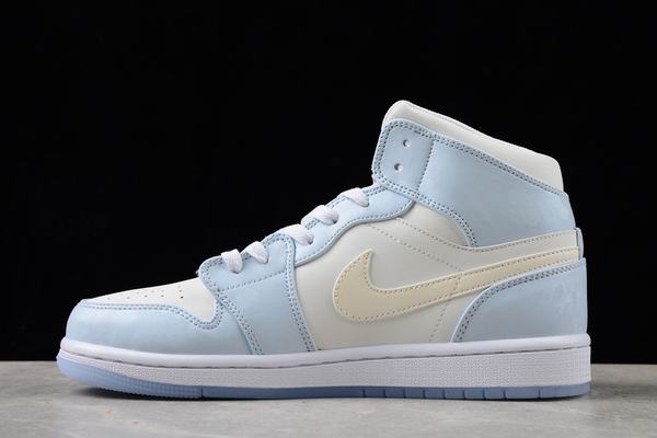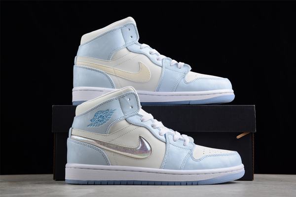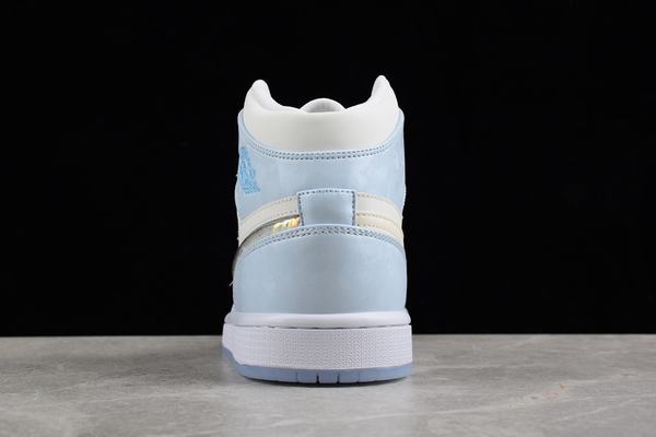 Air Jordan 1 Mid Glitter Swoosh Ice blue and silver crystal mid-top sneakers FQ9117-400. Lavender is added to the tongue of the shoe, and the powder in the transparent Swoosh moves with the upper foot. A gradual color transparent bubble style, in which powder is added, resembles a recyclable filler element. The outer Swoosh of the shoe is shaped with hourglass, the inner liner and insole are colored with white and blue, and the powder in the transparent Swoosh moves with the upper foot, the upper is ivory white and light blue, and the tongue is added with lavender.