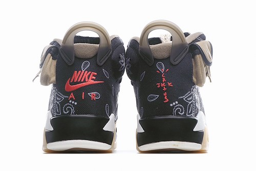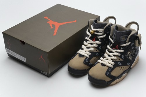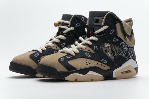 The color of TS x Air Jordan 6 Retro Gold Digger is mainly cashew flower, and the details are supplemented by eye-catching orange accents, bringing a strong military style. A canvas pocket was added on the outside of the upper to pay tribute to the gold rush culture of the hometown of Texas. The label of "Cactus Jack" is printed on the right heel, demonstrating the extraordinary identity of the shoe.