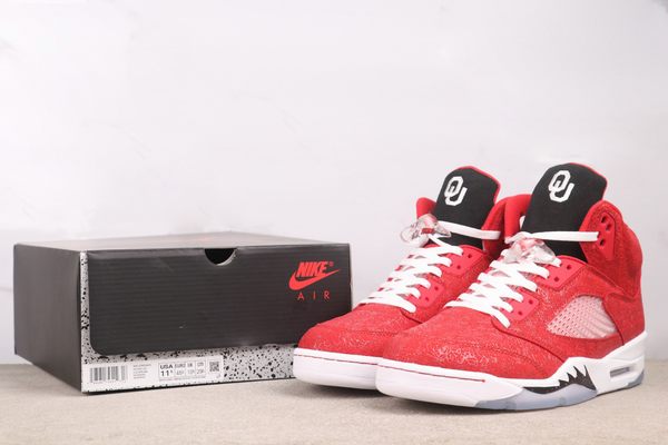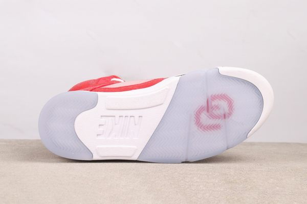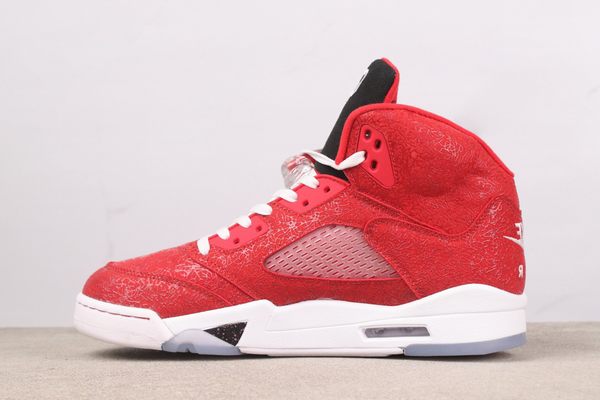 The signature breathable mesh design on the side of the shoe, set off by a red background, appears particularly exquisite. It not only ensures the shoe's excellent breathability, allowing the feet to breathe freely while wearing, maintaining dryness and comfort, but also adds a sense of technology and fashion to the overall look. The classic shark-tooth design on the midsole is presented in black and white, creating a sharp contrast with the red upper. The lines are smooth and dynamic, not only enhancing the sporty nature of the shoes but also becoming a signature visual symbol of the Air Jordan 5 series.