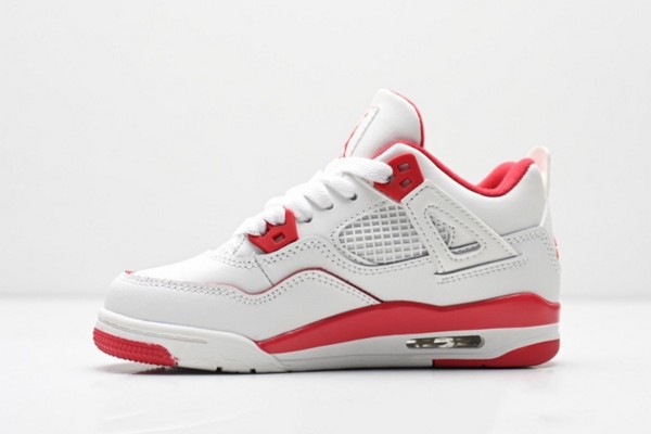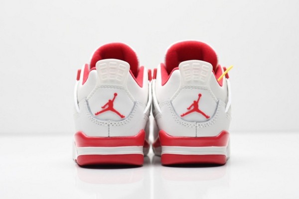 This shoe is based on the classic mid-top contour of Air Jordan 4, retaining the iconic heel curve and layering of the shoe body. The upper is made of high-quality leather: white leather covers the heel, both sides of the shoe body and the heel, while red leather covers the middle and lower part of the shoe body and the heel. The bright red color is like a flame, contrasting sharply with the white. The Swoosh logo on the side is presented in a smooth arc, retaining the classic genes while injecting a touch of vitality into the whole. The "A Ma Maniere"字样 on the heel is embossed on the red leather, highlighting the unique identity of the shoe.