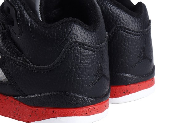 The shoe body is covered with delicate black lacquered leather, and the matte texture highlights the cool atmosphere under the light. It perfectly continues the iconic transparent mesh side window and shark-tooth-shaped midsole of Air Jordan 5, both replicating the classic recognition of AJ5 and ensuring the support and breathability of the shoe surface. The red shark-tooth lines and splatter details on the midsole have a strong visual impact, perfectly echoing the passionate genes of the classic "black and red" color scheme, and aligning with the lively personality of children.