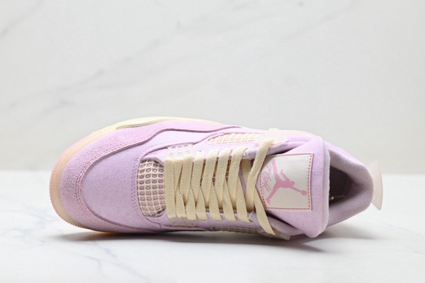 This shoe is based on the classic mid-top contour of Air Jordan 4, retaining the iconic heel curve and layering of the shoe body. The upper is made of high-quality leather: pink leather covers the heel, both sides of the shoe body and the heel, with a delicate texture like silk soaked in dusk, bringing a gentle and high-end feeling; white leather covers the middle and lower part of the shoe body and the heel, with pure white and pink forming a sharp contrast. The Swoosh logo on the side is presented in a smooth arc, retaining the classic genes while injecting a touch of vitality into the whole. The "TEX Iced Carmine"字样 on the heel is embossed on the pink leather, highlighting the unique identity of the shoe.