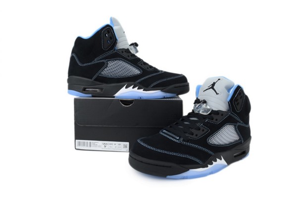 This shoe is based on the classic high-top contour of Air Jordan 5, retaining the iconic heel curve and layering of the shoe body. The upper is made of high-quality leather: black leather covers the heel, both sides of the shoe body and the heel, with a delicate texture like ink-soaked silk, bringing a stable and high-end feeling; blue leather covers the middle and lower part of the shoe body and the heel, with clear blue like the sky, forming a sharp contrast with black. The Swoosh logo on the side is presented in a smooth arc, retaining the classic genes while injecting a touch of vitality into the whole. The "Black University Blue 2026" is embossed on the blue leather at the heel, highlighting the unique identity of the shoe.