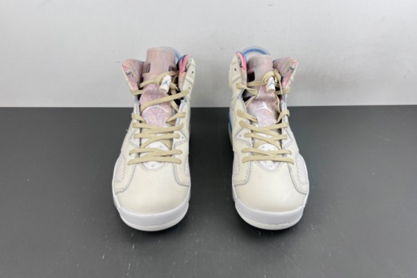 The main body of the shoe is made of delicate and soft beige lychee patterned leather, with a warm and matte texture that is clean and high-end. It perfectly continues the iconic high top contour of the Air Jordan 6, with breathable mesh structure on the sides and classic lace hole design. The dense breathable punching of the shoe body balances the support of the upper and the breathability of wearing in spring and summer, fully replicating the classic AJ6 style with full recognition. The angular module of the shoe body and the heel pull ring are embellished with pure sports blue, and the soft and warm tones collide, shedding the pure white monotony and replicating the classic Sport Blue color scheme's retro and refreshing style.